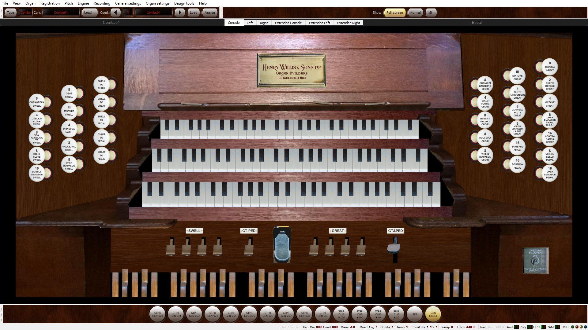In order to extend the instrument slightly, I have added octave and sub octave couplers to the Swell and Choir and enclosed the Choir division. The manuals have been extended to 61 notes and the pedal to 32. I have included a Pedal Bass and Melody couplers to both the Choir and Swell together with an increased number of playing aids. I have also added tremulants to the Swell and Choir. This of course does not detract from the overall sound of the organ which remains unaltered and has no other additions. It is thus an accurate facsimile of the original. There are two console views; the first reflects the layout of the real instrument (together with 56 note manuals and 30 note pedals) and the second extends the compass and adds the extra couplers and other features.