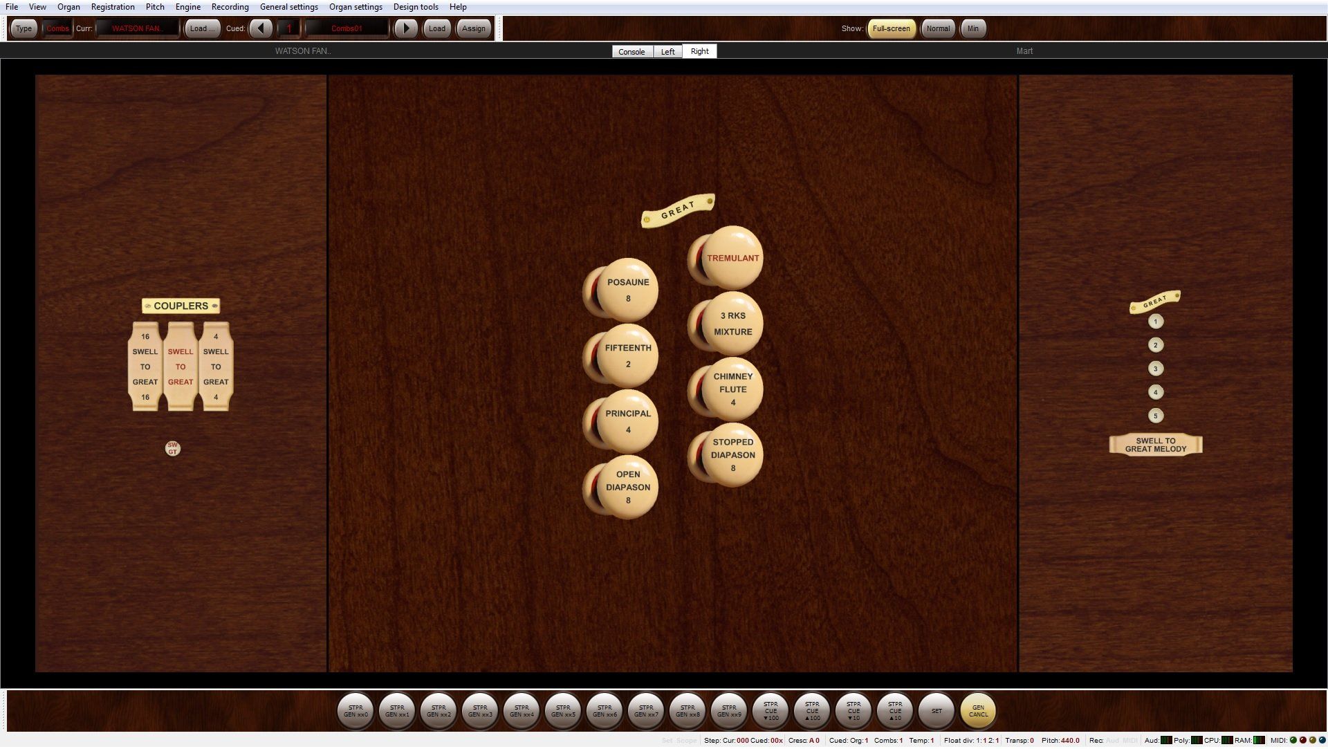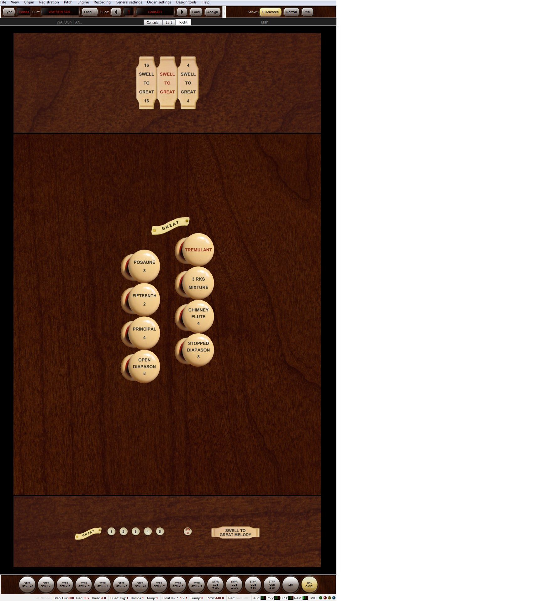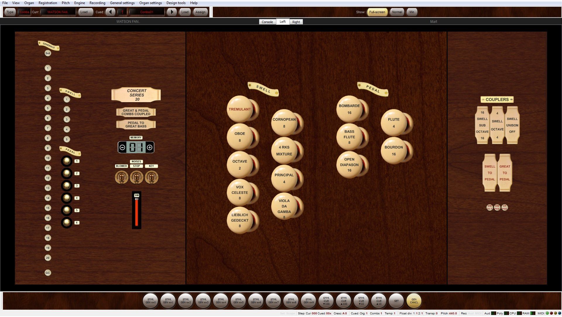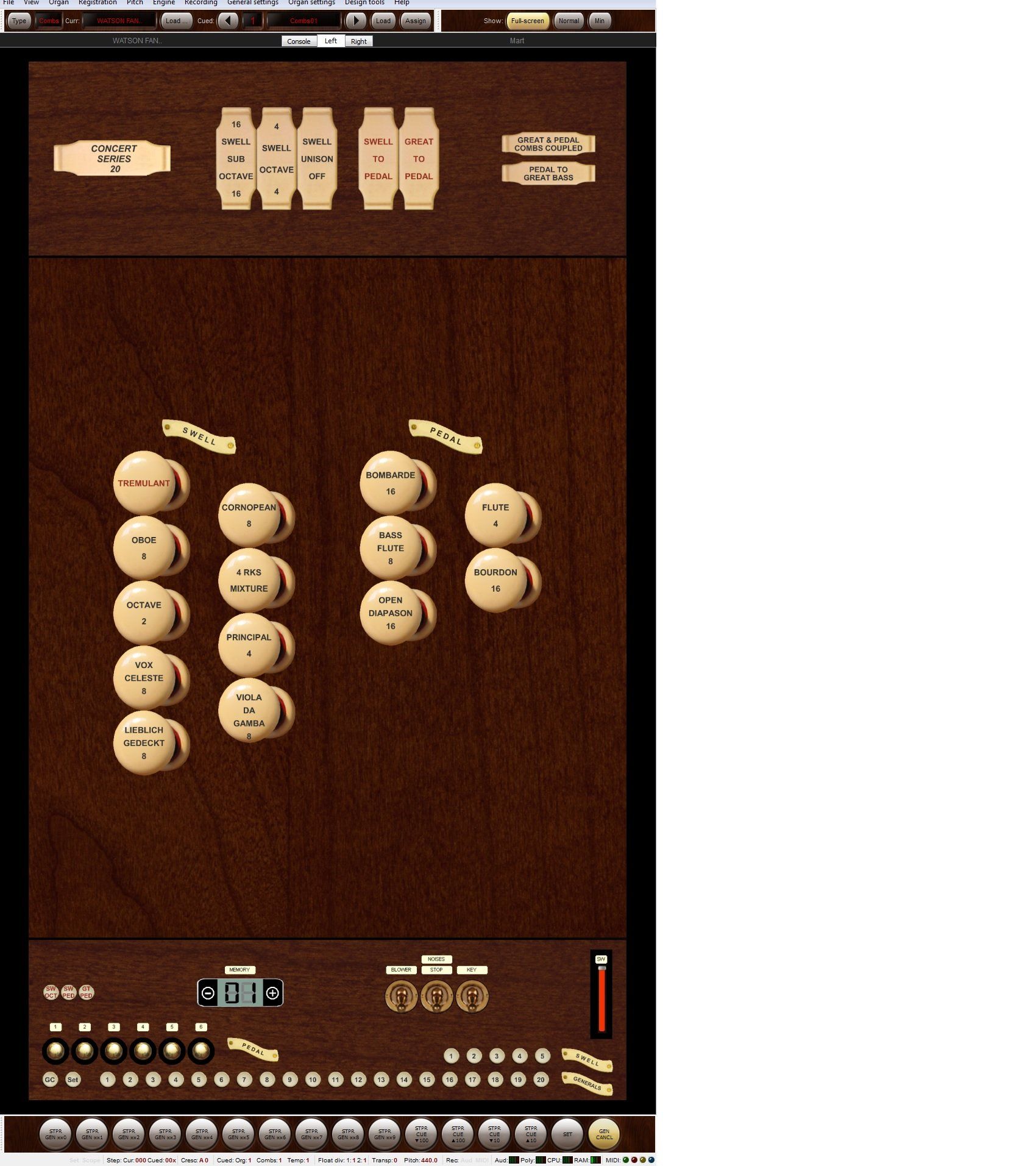 Der Concert 20 bietet eine sehr ausgewogene Spezifikation innerhalb einer kleinen Anzahl von Registern. Mit Ausnahme einzelner Mutationsregister bietet das Instrument so ziemlich alles, was für einen Großteil des Repertoires benötigt wird. Die Oktav- und Suboktavkoppler in der Swell-Orgel ermöglichen einen typisch englischen Swell-Klang und die Bereitstellung eines Rohrblatts auf der Great-Orgel ermöglicht Trompeten-Freiwilligen oder mit sorgfältiger Wahl des Begleitregisters auf der Swell die typischen Tuba-Melodien, die von englischen Organisten so beliebt sind . Der Melody-Koppler für den Swell bietet weitere Flexibilität. Die Samples werden in ihrer eng aufgenommenen und trockenen Form zur Auswertung mit der HW V Convolution Reverberation-Funktion geliefert.
