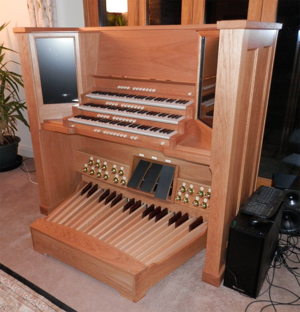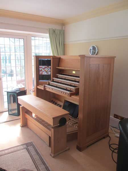 The three manual console shown above is one of our standard models that was developed especially for us. It is constructed from from solid panelled oak built on a poplar frame. Incorporating 3 x UHT keyboards and 32 note rear sprung pedalboard with rosewood sharps, adjustable organ bench in solid oak with motorised adjustment (not shown), Harrison & Harrison pattern solid brass pistons, Kimber Allen swell pedals and thumb pistons plus 2 x 22" built in touch screens. Also included is the Midi controller interface for the whole console. This standard console is designed to fit through a conventional domestic doorway. Available in different shades of colour and alternative wood grains to match as required. An alternative frame will allow the console to be dismantled further for where access is particularly difficult such as up a narrow stairway.