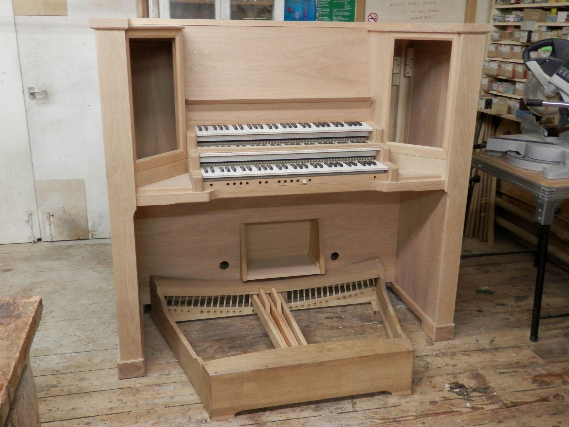 Whilst the above console uses solid oak which is costly, the same model can be produced using composite boards. Although the appearance is almost identical, the cost savings are considerable. The main difference lies in some of the edge mouldings which can only be undertaken using solid oak. The remainder of the console frame remains the same. Likewise, using standard Fatar keyboards would reduce the overall price by several thousand pounds.
