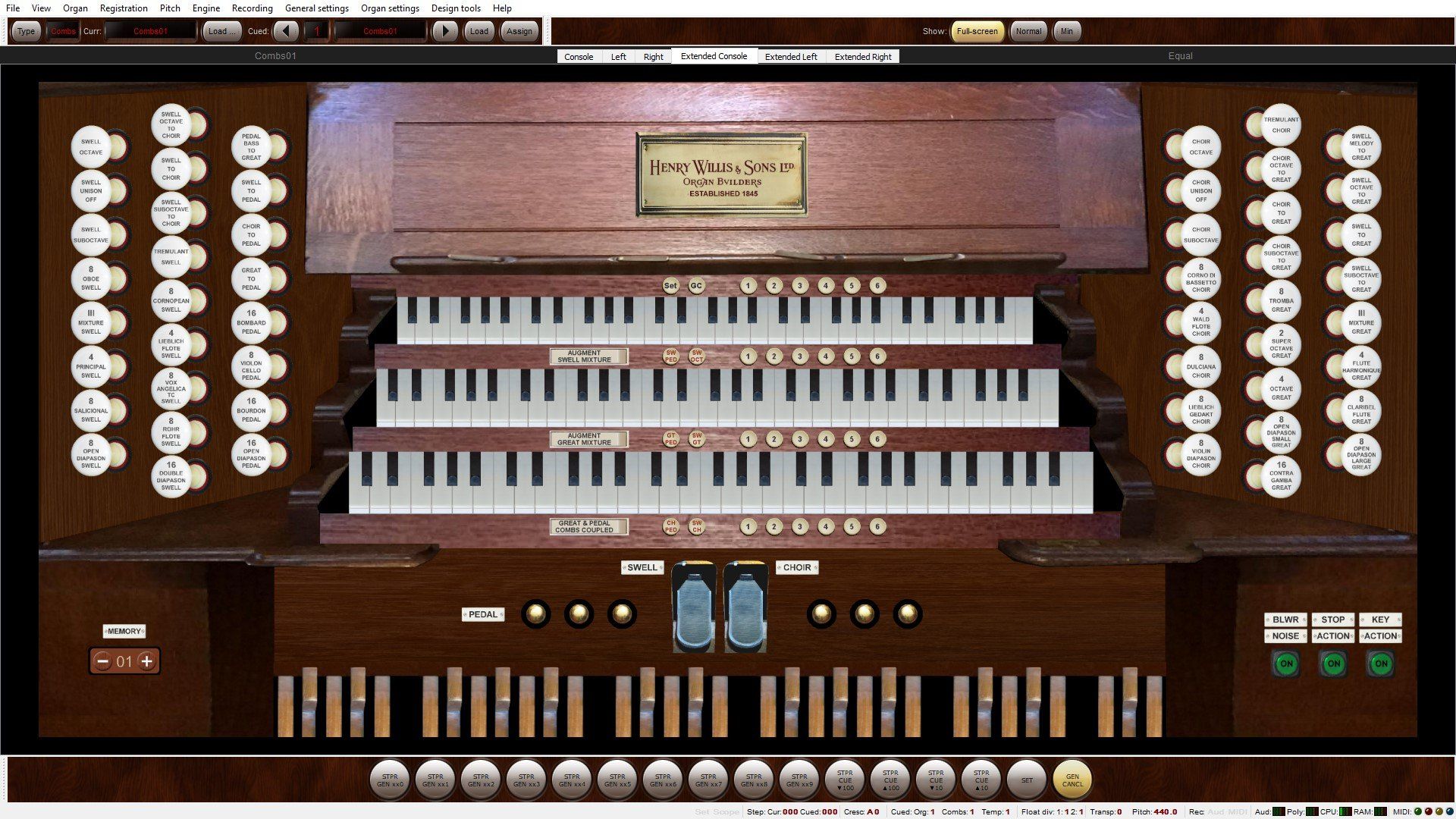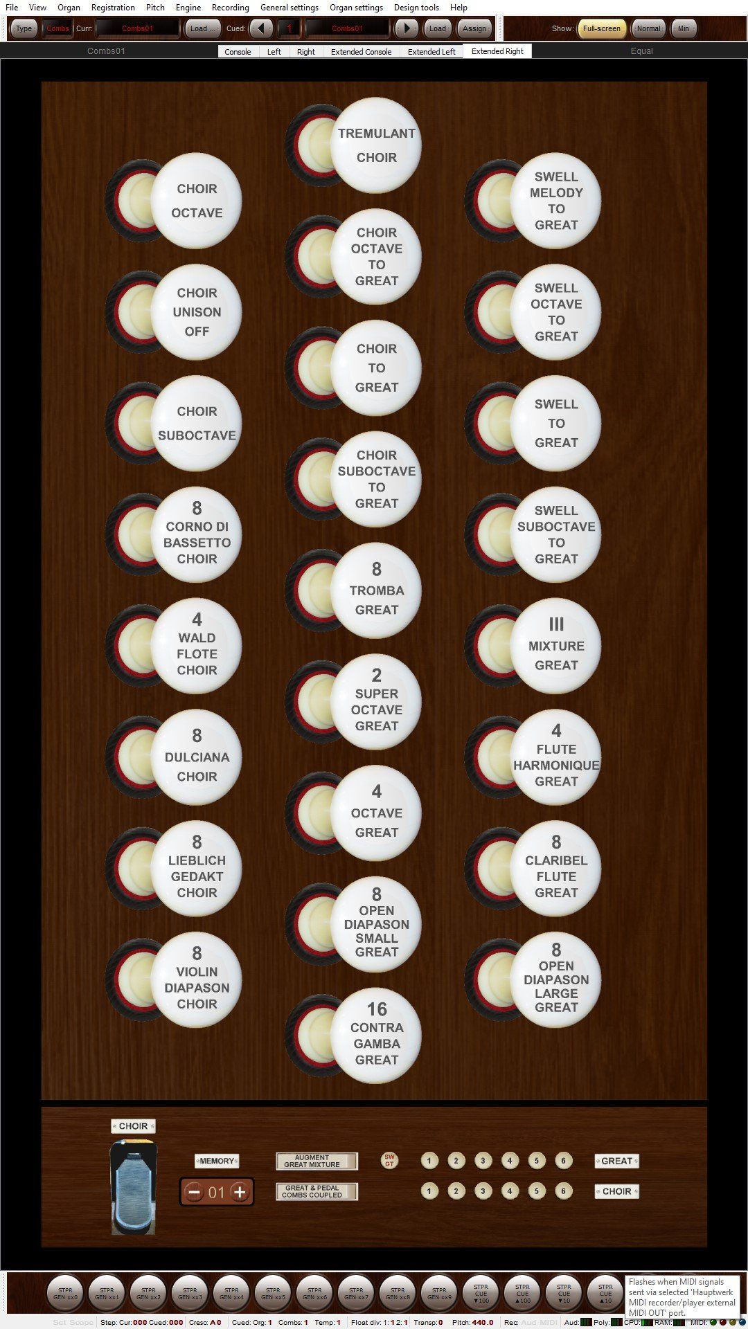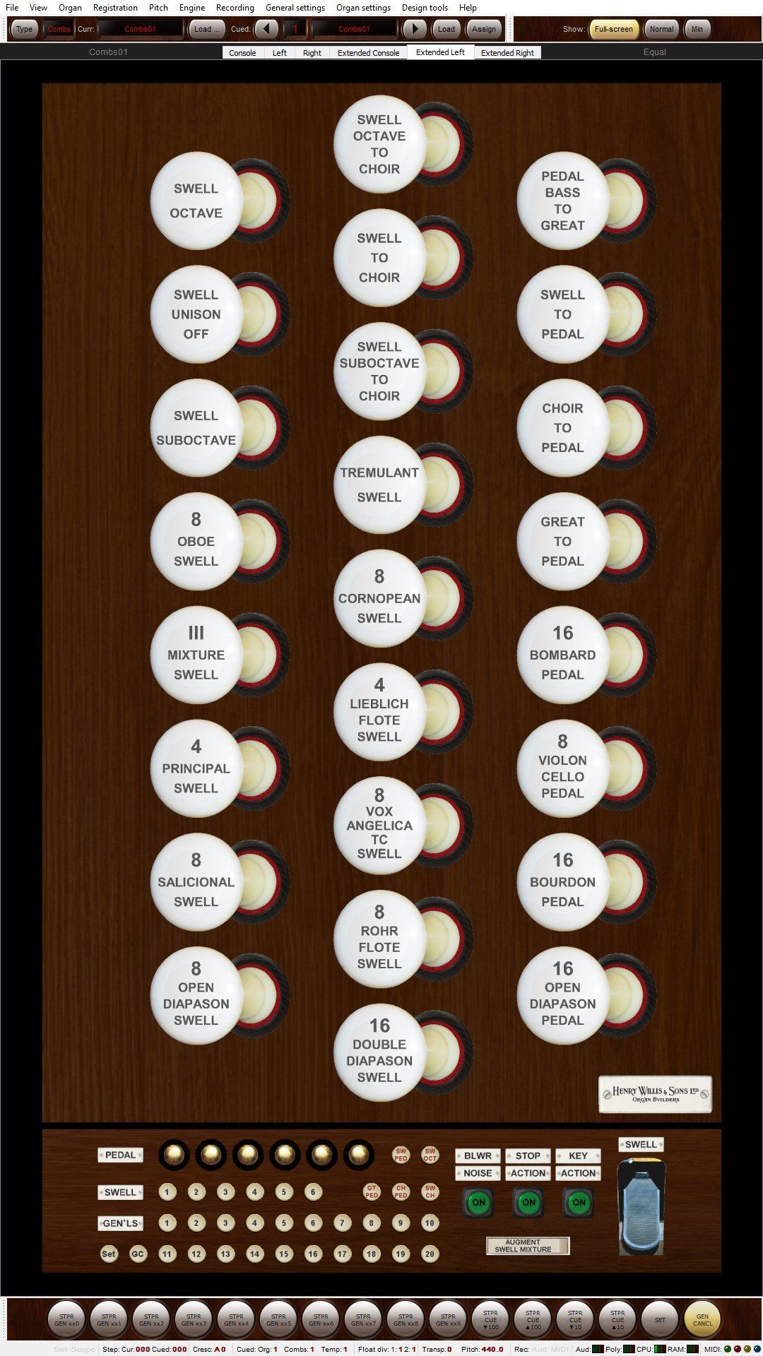 In order to extend the instrument slightly, I have added octave and sub octave couplers to the Swell and Choir and enclosed the Choir division. The manuals have been extended to 61 notes and the pedal to 32. I have included a Pedal Bass and Melody couplers to both the Choir and Swell together with an increased number of playing aids. I have also added tremulants to the Swell and Choir. This of course does not detract from the overall sound of the organ which remains unaltered and has no other additions. It is thus an accurate facsimile of the original. There are two console views; the first reflects the layout of the real instrument (together with 56 note manuals and 30 note pedals) and the second extends the compass and adds the extra couplers and other features.