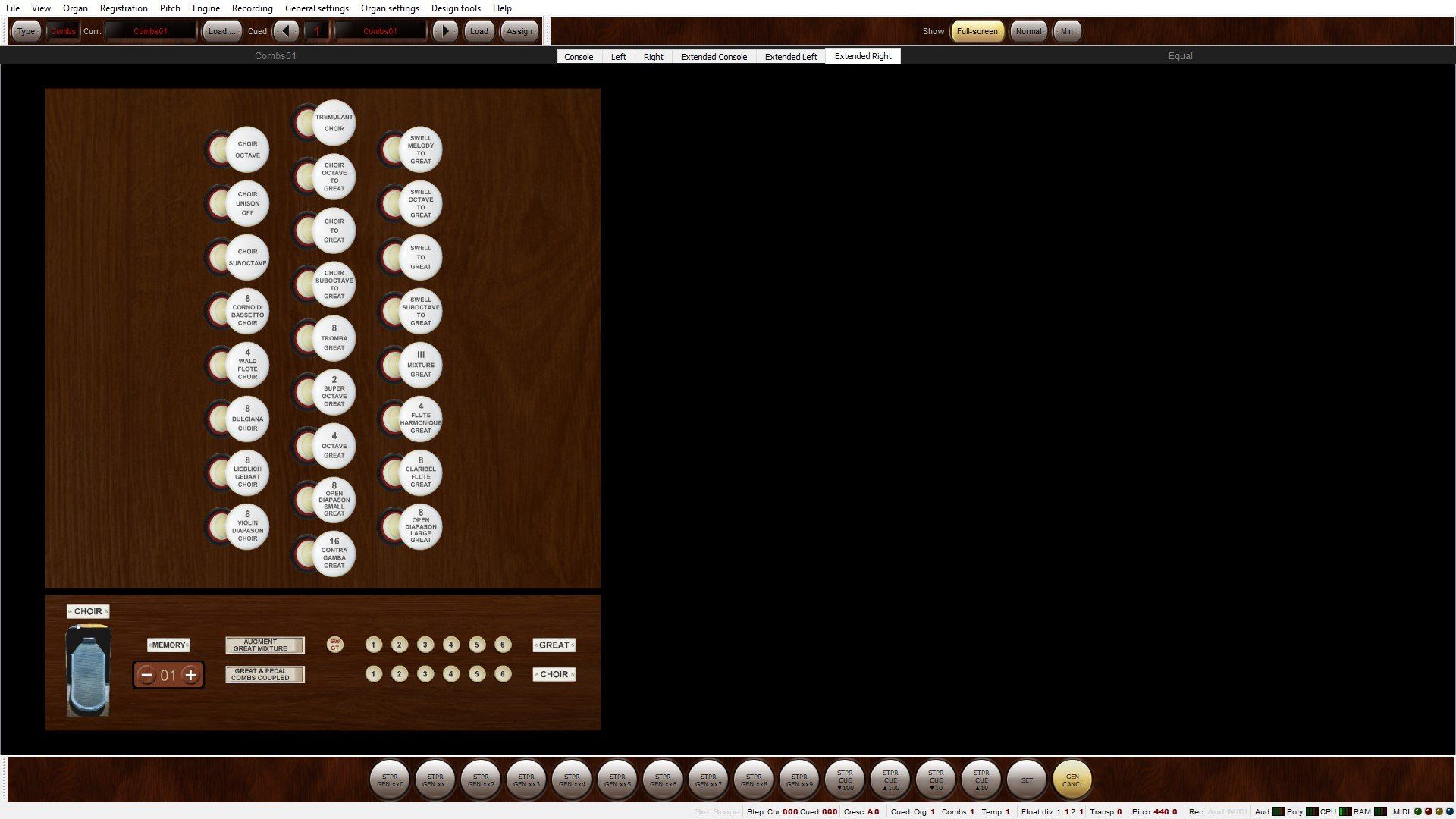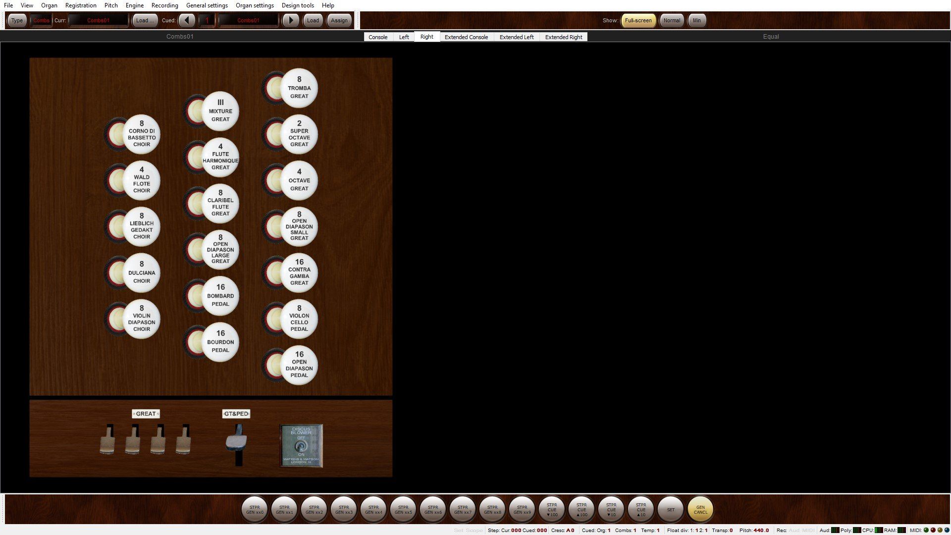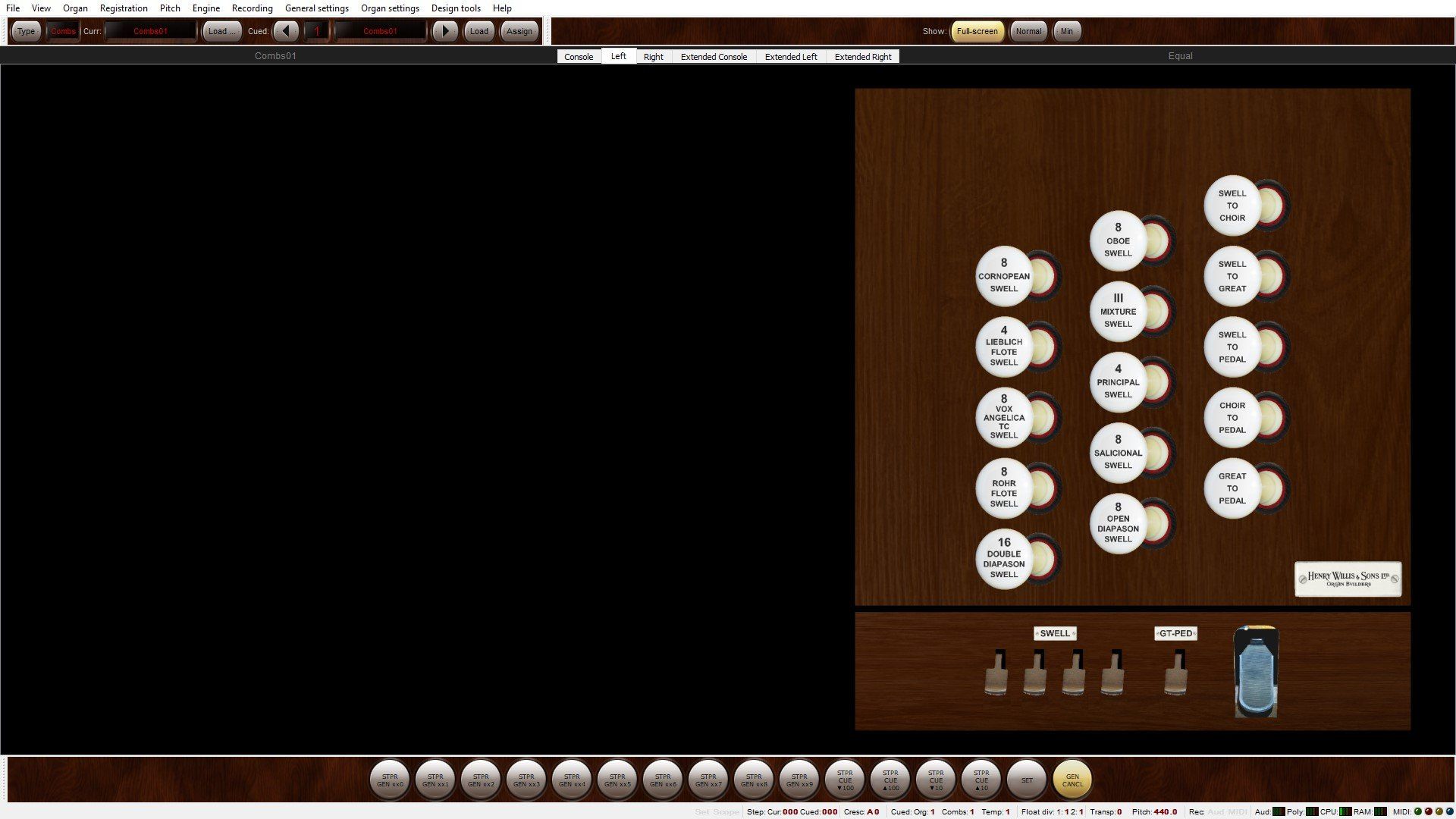 In order to extend the instrument slightly, I have added octave and sub octave couplers to the Swell and Choir and enclosed the Choir division. The manuals have been extended to 61 notes and the pedal to 32. I have included a Pedal Bass and Melody couplers to both the Choir and Swell together with an increased number of playing aids. I have also added tremulants to the Swell and Choir. This of course does not detract from the overall sound of the organ which remains unaltered and has no other additions. It is thus an accurate facsimile of the original. There are two console views; the first reflects the layout of the real instrument (together with 56 note manuals and 30 note pedals) and the second extends the compass and adds the extra couplers and other features.