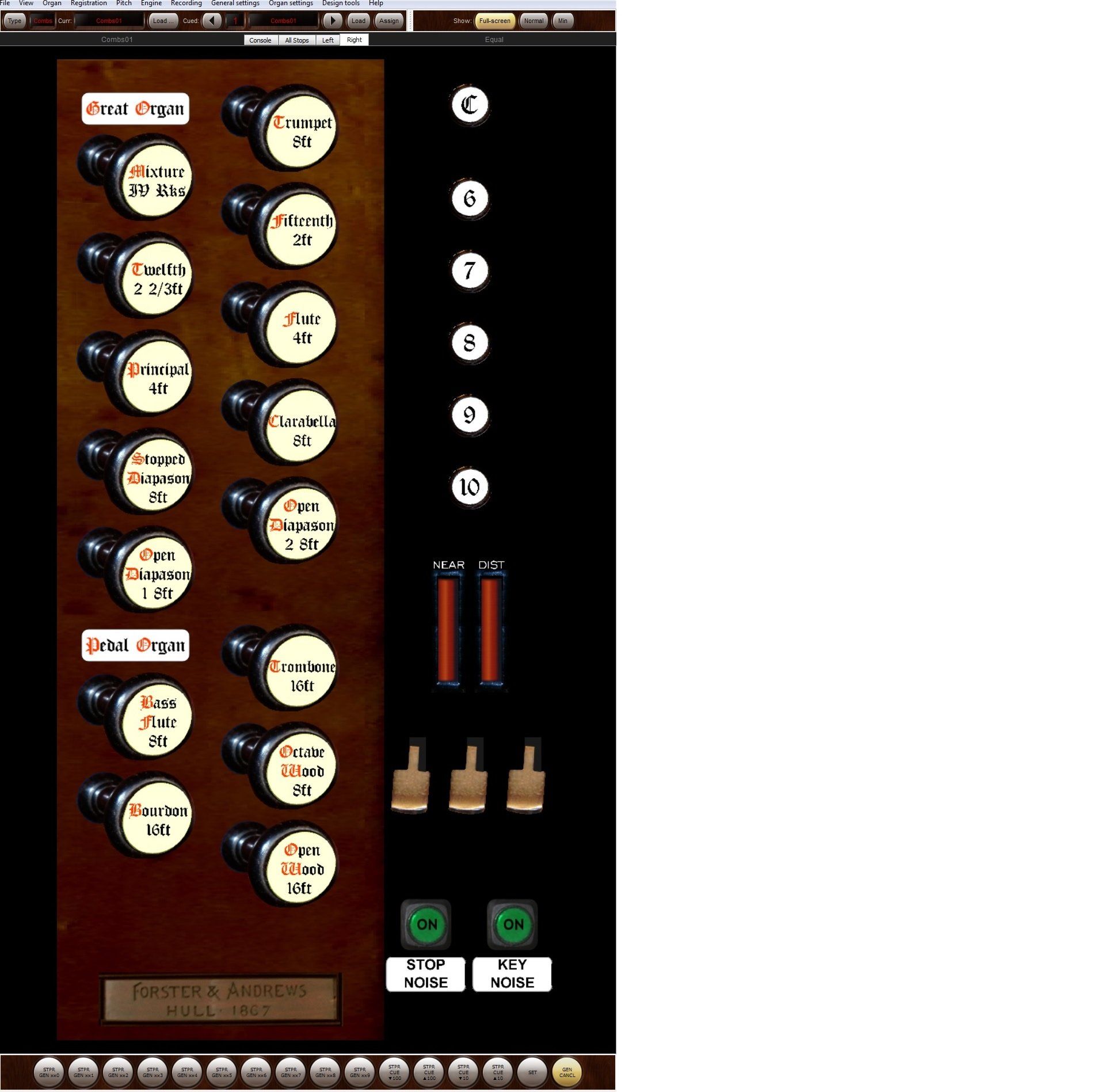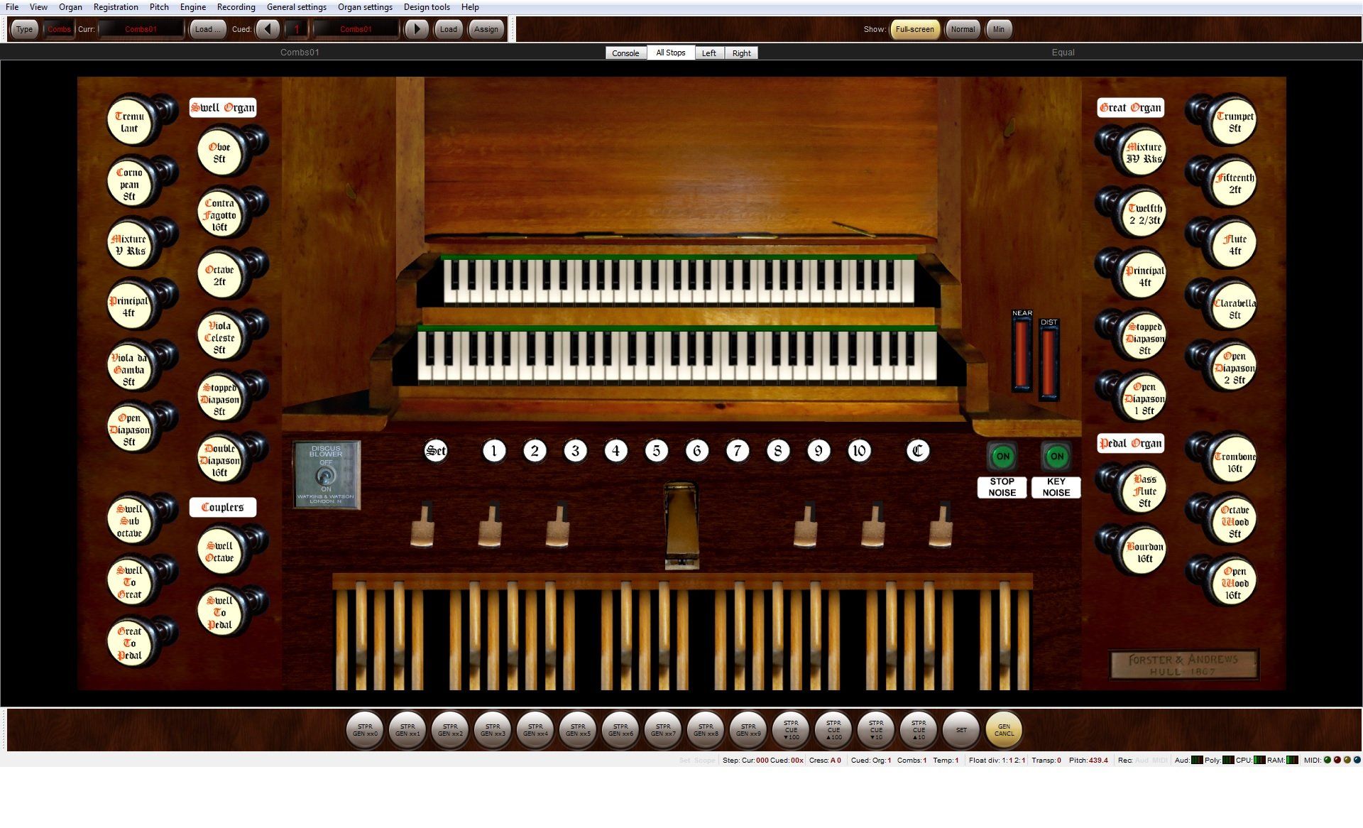 In addition to the standard intermanual and pedal couplers we have provide Octave and Sub-octave couplers to the Swell as well as A Pedal Bass and a Swell to Great melody coupler. The organ is presented in two perspectives: Close and Medium Distant. The volume levels of each perspective can be adjusted via the volume sliders.